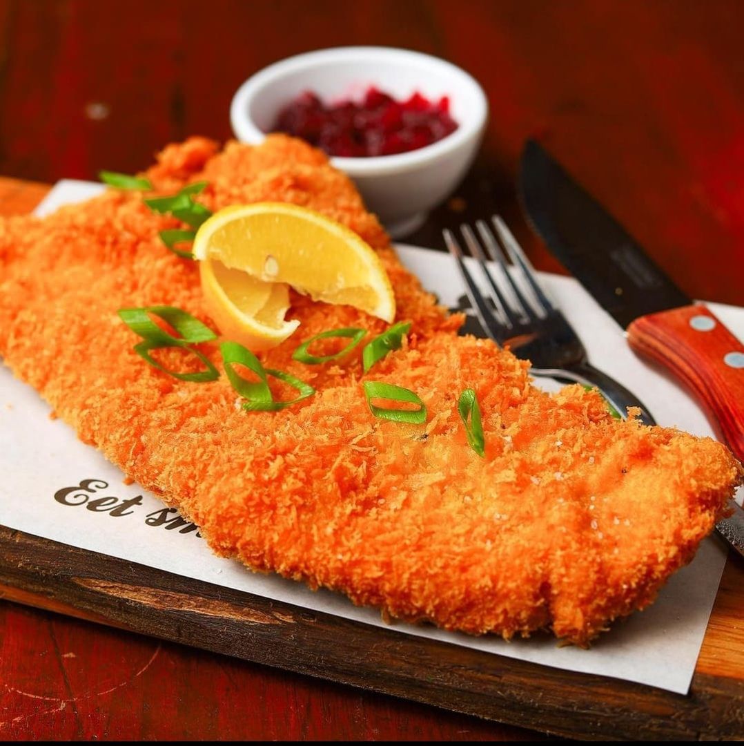 Onze klassieker van het moment. Mals geslagen varkensbil in een krokante pankokorst geserveerd met zeezout, citroentje en cranberry compote.
