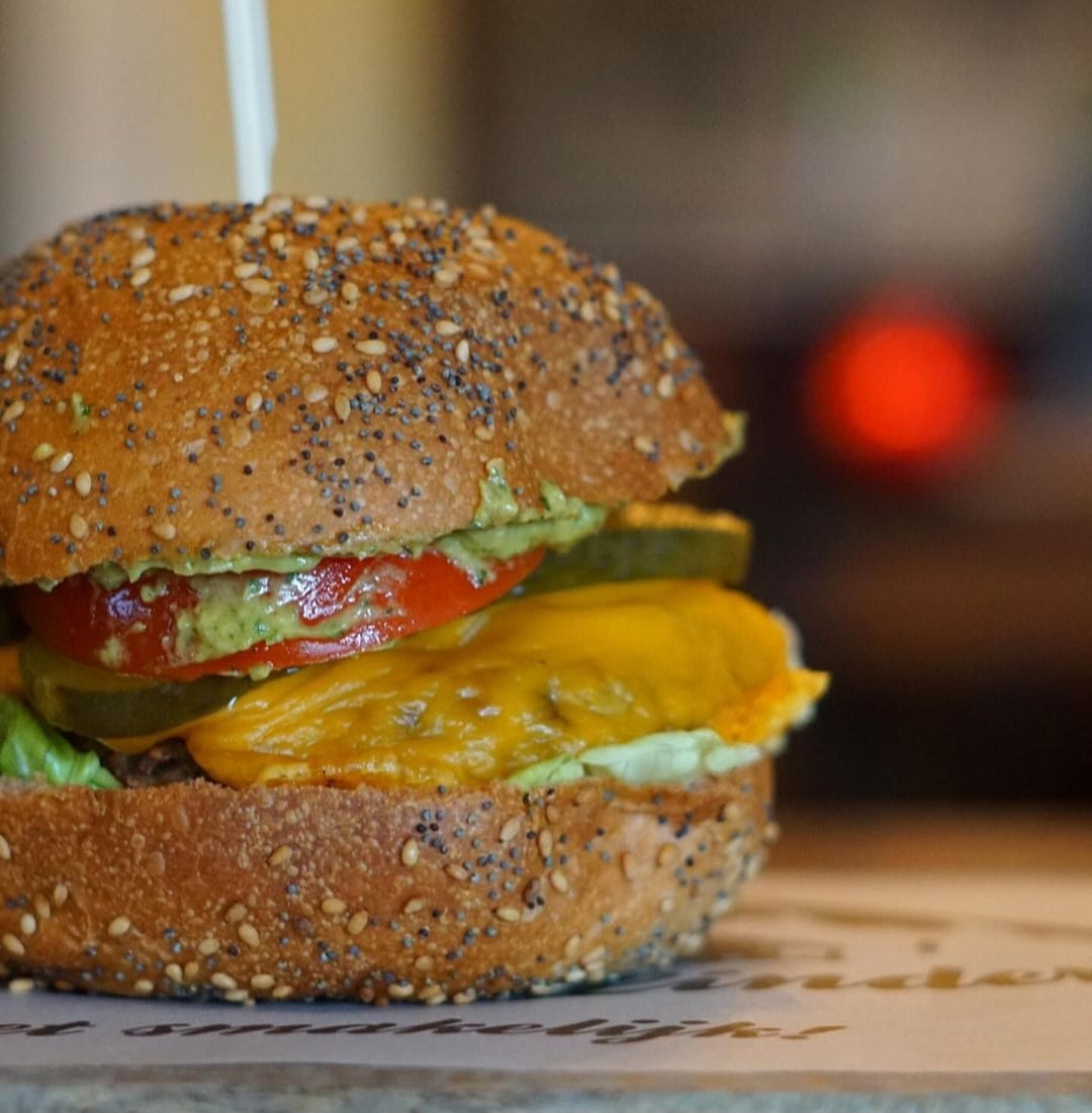 Vegan burger op basis van oesterzwam met vegan cheddar, little gem, tomaat, augurk en guacamole. Geserveerd op een vegan brioche broodje van Ivo's Bakery.